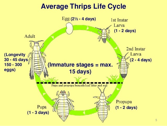 Generations per year up to 40. The thrip life cycle takes approximately 2 weeks completes and consists of an egg stage a feeding larval stage non-feeding prepupal and pupal stages and finally an adult stage. After two molts the larva enters the pre-pupal stage lasts about 1 day during which wing buds are developing externally.